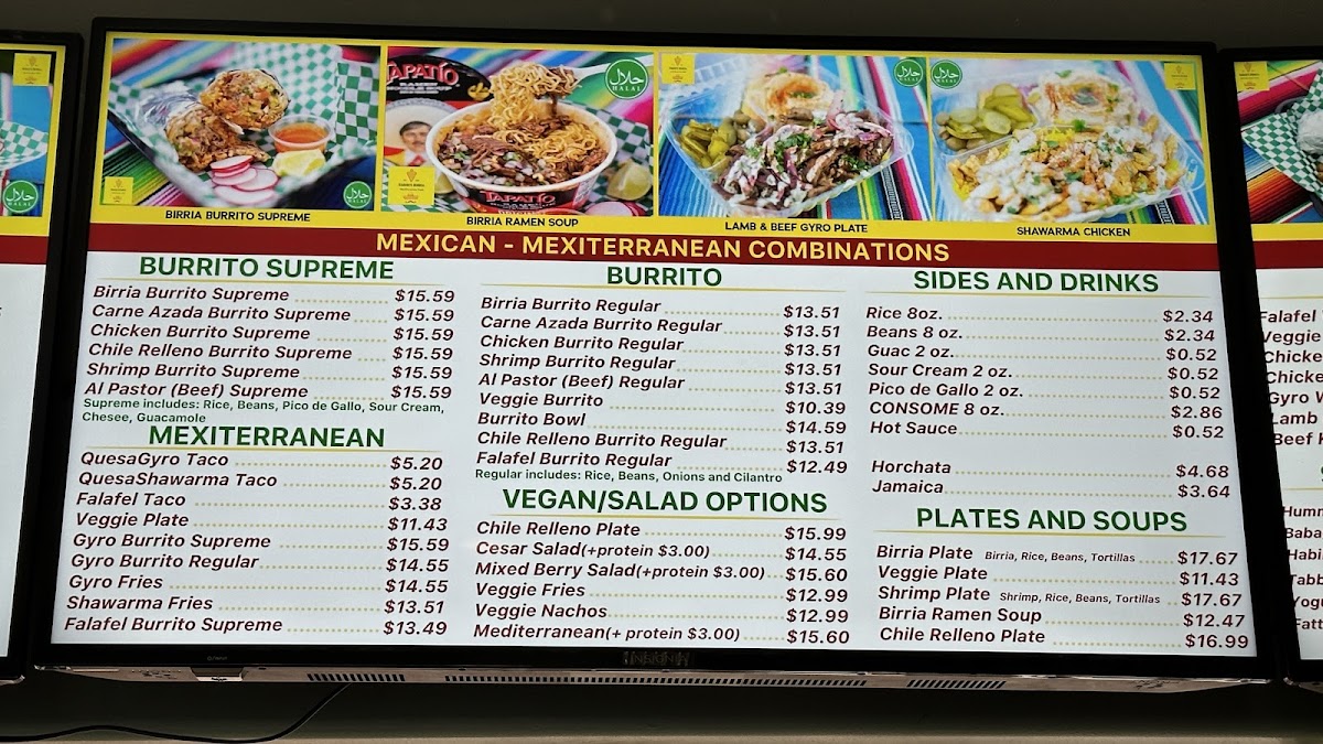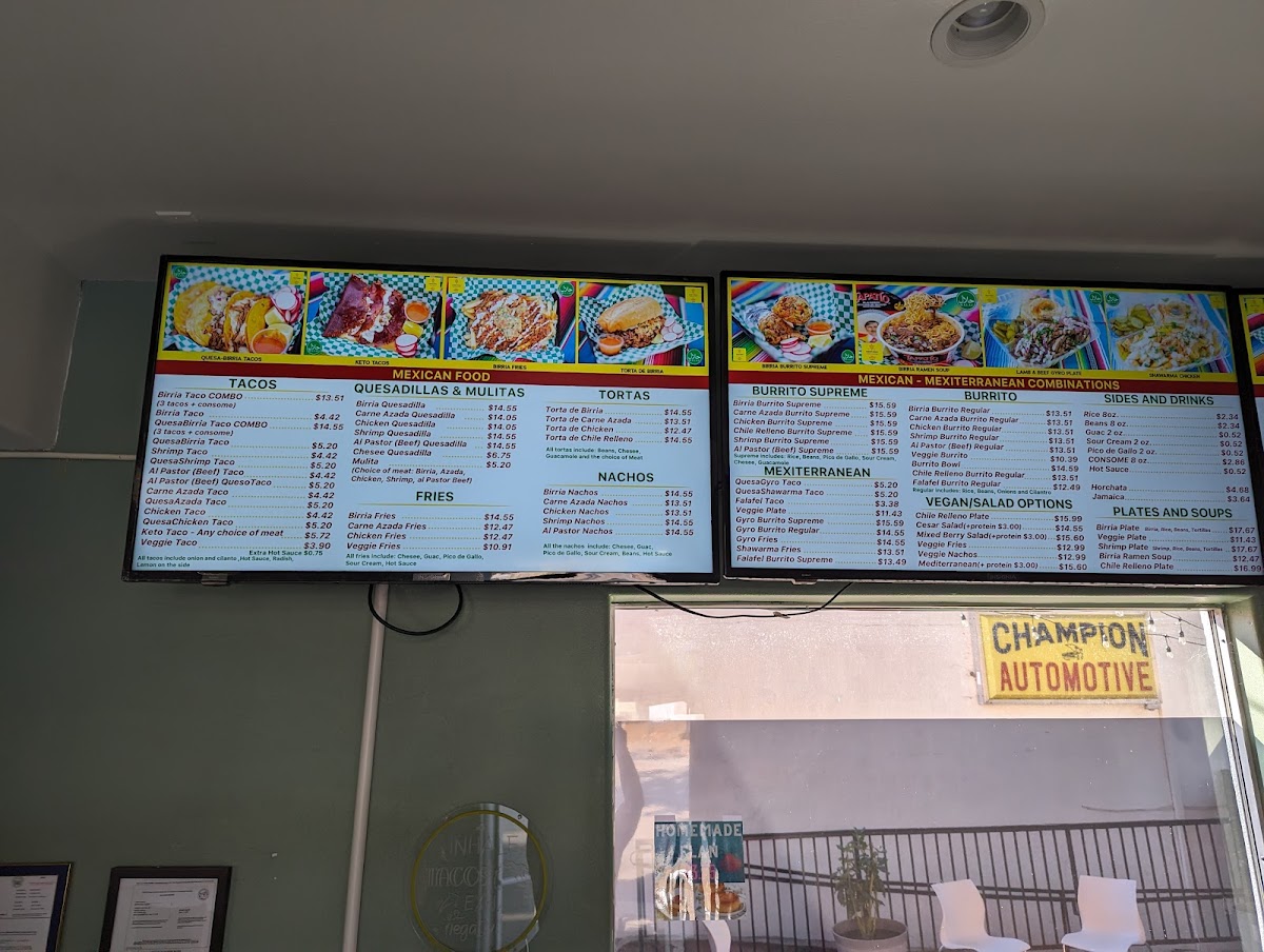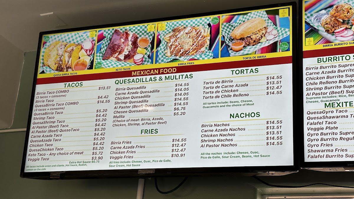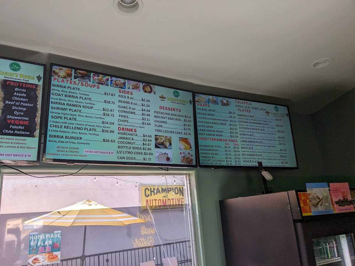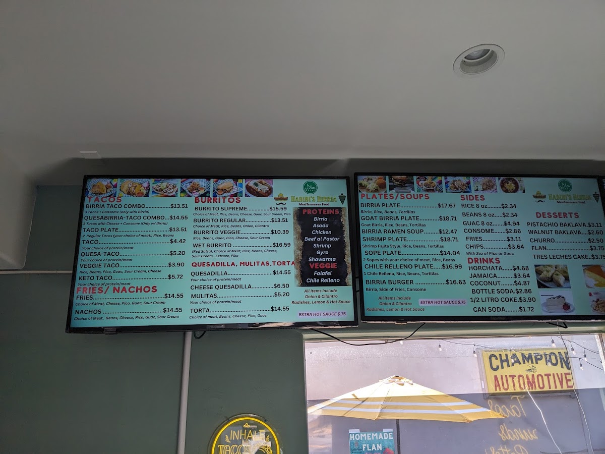 From a reviewer’s standpoint, Habibi's Birria on 403 Lewis Ave offers a menu that’s as diverse as it is indulgent, showcasing an array of options that cater to both traditional Mexican tastes and Mediterranean favorites. For burrito lovers, the Birria Burrito Supreme, Carne Azada Burrito Supreme, Chicken Burrito Supreme, Shrimp Burrito Supreme, and Al Pastor (Beef) Supreme deliver hearty, flavorful portions. Taco enthusiasts can savor the Birria Taco Combo, Birria Taco, QuesoBirria Combo, Quesobirria Taco, and Shrimp Taco, while wraps like the Falafel Wrap, Veggie Wrap, Chicken Shawarma Wrap (D&W Meat), Chicken Kabob Wrap (White Meat), and Gyro Wrap (Lamb And Beef) provide a lighter yet satisfying alternative. The plates-Habibi's Plate, Chicken Shawarma Plate, Chicken Kabob Plate, Gyro Plate, and Lamb Kabob Plate-offer generous servings perfect for a filling meal. Salads such as Habibi's Salad 8oz, Habibi's Salad 16oz, Tabouleh 8oz, Tabouleh 16oz, and Yogurt Cucumber Salad 8oz balance the menu with freshness, while indulgent desserts including Pistachio Baklava, Walnut Baklava, Flan, Tres Leches Cake, and Red Velvet Cake provide sweet finales. Quesadillas and mulitas feature options like Birria Quesadilla, Al Pastor (Beef) Quesadilla, Chicken Quesadilla, Gyro Quesadilla, and Carne Azada Quesadilla, whereas tortas like Torta Al Pastor, Torta De Birria, Torta De Birria Chivo, Torta De Chile Relleno, and Torta De Carne Azada offer robust handheld meals. Fans of fries and nachos can choose from Gyro Fries, Shawarma Fries, Carne Azada Fries, Birria Fries, Al Pastor Fries, Shrimp Nachos, Birria Nachos, Chicken Nachos, Carne Azada Nachos, and Al Pastor Nachos. Specialties and seasonal highlights-such as the Birria Burger, Sope Plate, Goat Birria Plate, and weekend-only Goat Birra Quesadilla-add variety, complemented by refreshing drinks like Horchata, Jamaica, and Coconut Agua Fresca. Whether visiting for Taco Tuesday, SL Restaurant Week specials, or a classic plate, the menu at Habibi's Birria demonstrates a thoughtful mix of flavors, generous portions, and creative twists that leave diners spoiled for choice.