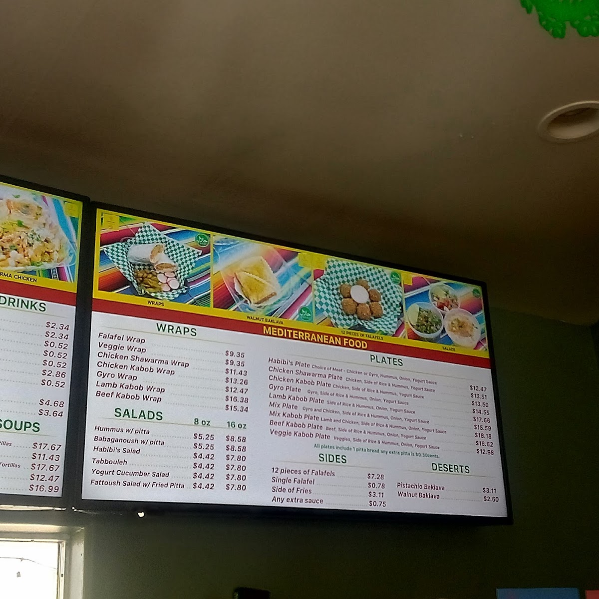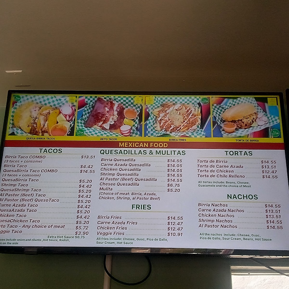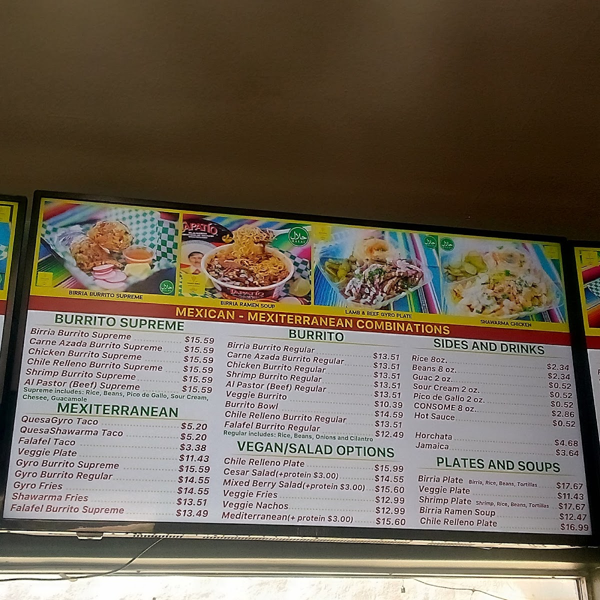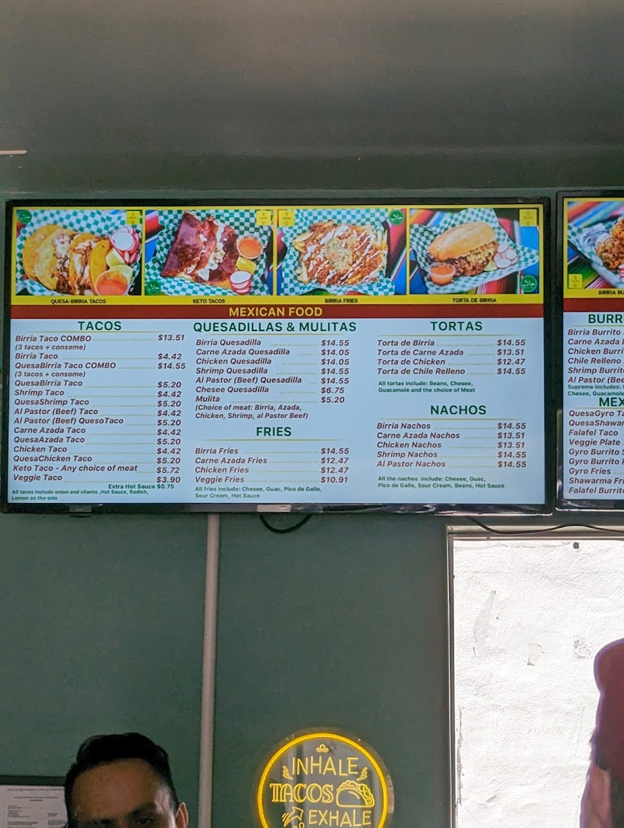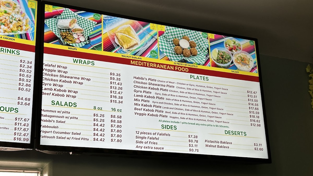 From a reviewer’s standpoint, Habibi's Birria on 403 Lewis Ave offers a menu that’s as diverse as it is indulgent, showcasing an array of options that cater to both traditional Mexican tastes and Mediterranean favorites. For burrito lovers, the Birria Burrito Supreme, Carne Azada Burrito Supreme, Chicken Burrito Supreme, Shrimp Burrito Supreme, and Al Pastor (Beef) Supreme deliver hearty, flavorful portions. Taco enthusiasts can savor the Birria Taco Combo, Birria Taco, QuesoBirria Combo, Quesobirria Taco, and Shrimp Taco, while wraps like the Falafel Wrap, Veggie Wrap, Chicken Shawarma Wrap (D&W Meat), Chicken Kabob Wrap (White Meat), and Gyro Wrap (Lamb And Beef) provide a lighter yet satisfying alternative. The plates-Habibi's Plate, Chicken Shawarma Plate, Chicken Kabob Plate, Gyro Plate, and Lamb Kabob Plate-offer generous servings perfect for a filling meal. Salads such as Habibi's Salad 8oz, Habibi's Salad 16oz, Tabouleh 8oz, Tabouleh 16oz, and Yogurt Cucumber Salad 8oz balance the menu with freshness, while indulgent desserts including Pistachio Baklava, Walnut Baklava, Flan, Tres Leches Cake, and Red Velvet Cake provide sweet finales. Quesadillas and mulitas feature options like Birria Quesadilla, Al Pastor (Beef) Quesadilla, Chicken Quesadilla, Gyro Quesadilla, and Carne Azada Quesadilla, whereas tortas like Torta Al Pastor, Torta De Birria, Torta De Birria Chivo, Torta De Chile Relleno, and Torta De Carne Azada offer robust handheld meals. Fans of fries and nachos can choose from Gyro Fries, Shawarma Fries, Carne Azada Fries, Birria Fries, Al Pastor Fries, Shrimp Nachos, Birria Nachos, Chicken Nachos, Carne Azada Nachos, and Al Pastor Nachos. Specialties and seasonal highlights-such as the Birria Burger, Sope Plate, Goat Birria Plate, and weekend-only Goat Birra Quesadilla-add variety, complemented by refreshing drinks like Horchata, Jamaica, and Coconut Agua Fresca. Whether visiting for Taco Tuesday, SL Restaurant Week specials, or a classic plate, the menu at Habibi's Birria demonstrates a thoughtful mix of flavors, generous portions, and creative twists that leave diners spoiled for choice.